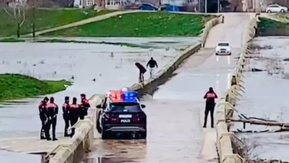Edirne'de yağış sonrası suyla kaplanan Yalnız Göz Köprüsü'nde iki kişi, polis uyarılarına rağmen köprünün kenarından yürüyerek karşıya geçti. O anlar çevrede endişeye sebep oldu.