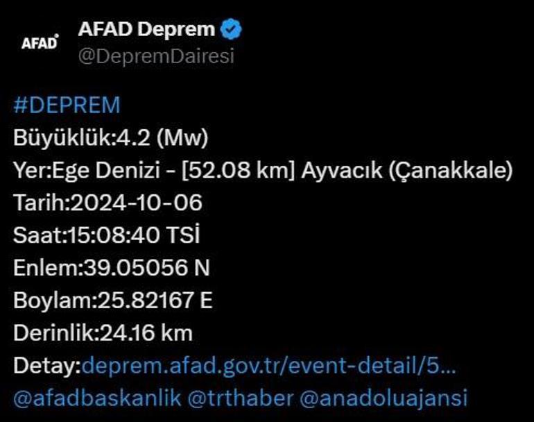 Ege Denizi'nden saat 15.08 sıralarında 4.2 büyüklüğünde deprem meydana geldi. Çanakkale'nin Ayvacık ilçesi açıklarındaki depremin derinliği 24.16 km olarak açıklandı.